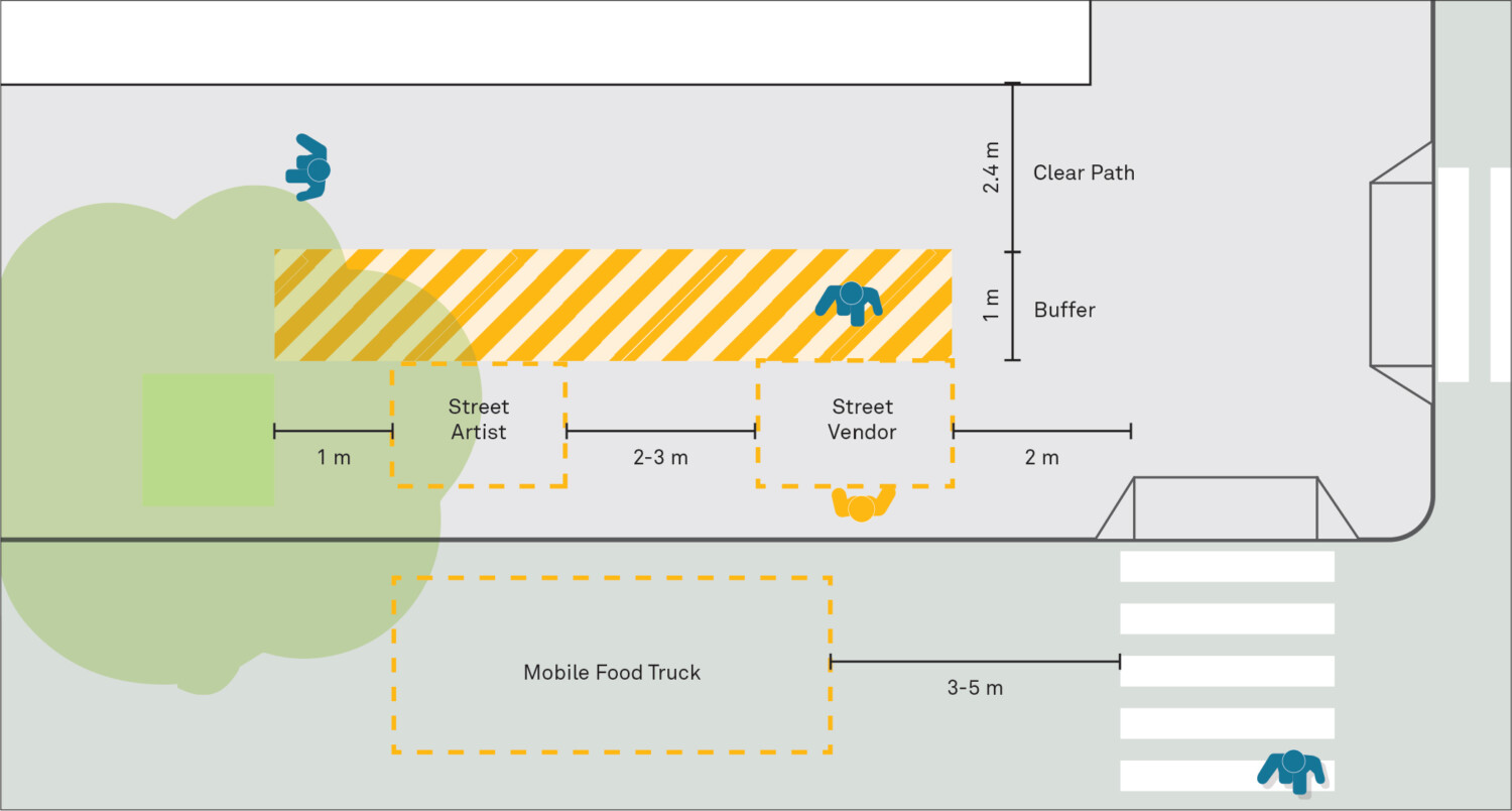 Street networks, context, size, and character should be analyzed to identify and map areas appropriate to accommodate commercial activity. Commercial activity should be allowed only in sidewalks that are at least 4 m wide and should not obstruct the clear path at any time. General locations for commercial activities within the street include: