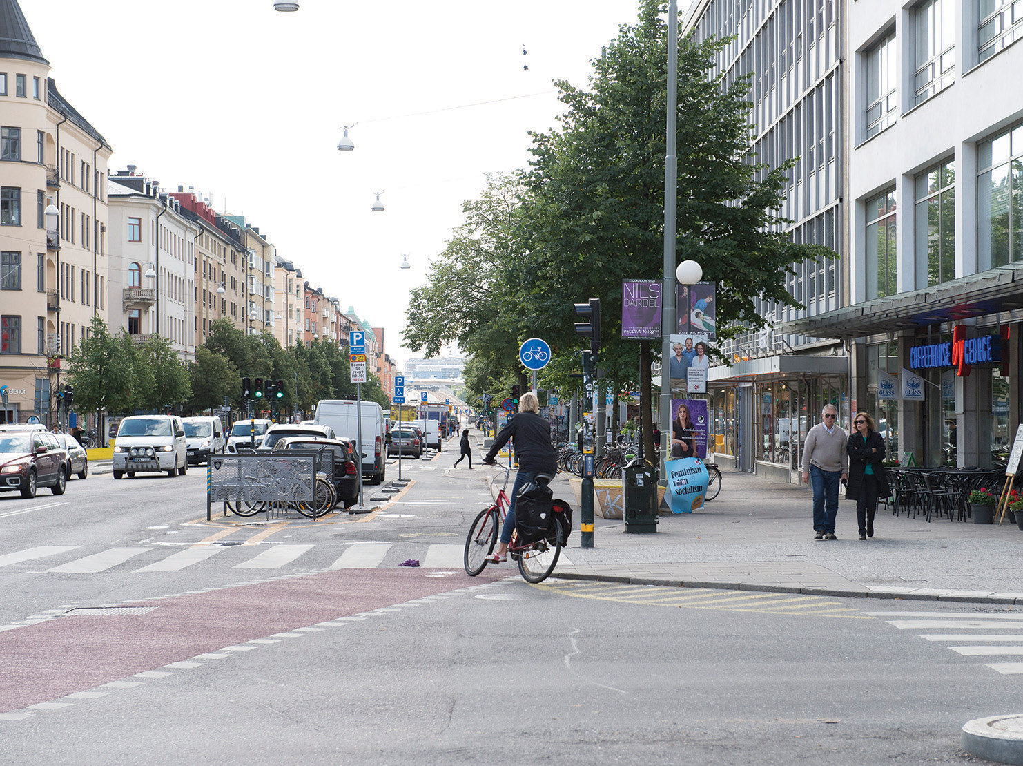 Central two-way streets present an opportunity for transformation that increases the street’s capacity to serve multiple users. Narrowing travel lanes, allocating space for cycling and collective transport, and upgrading the pedestrian environment improve the street’s performance. Incorporating public space and green infrastructure enhancements such as street trees, permeable paving, and parklets, can further invite vibrancy.