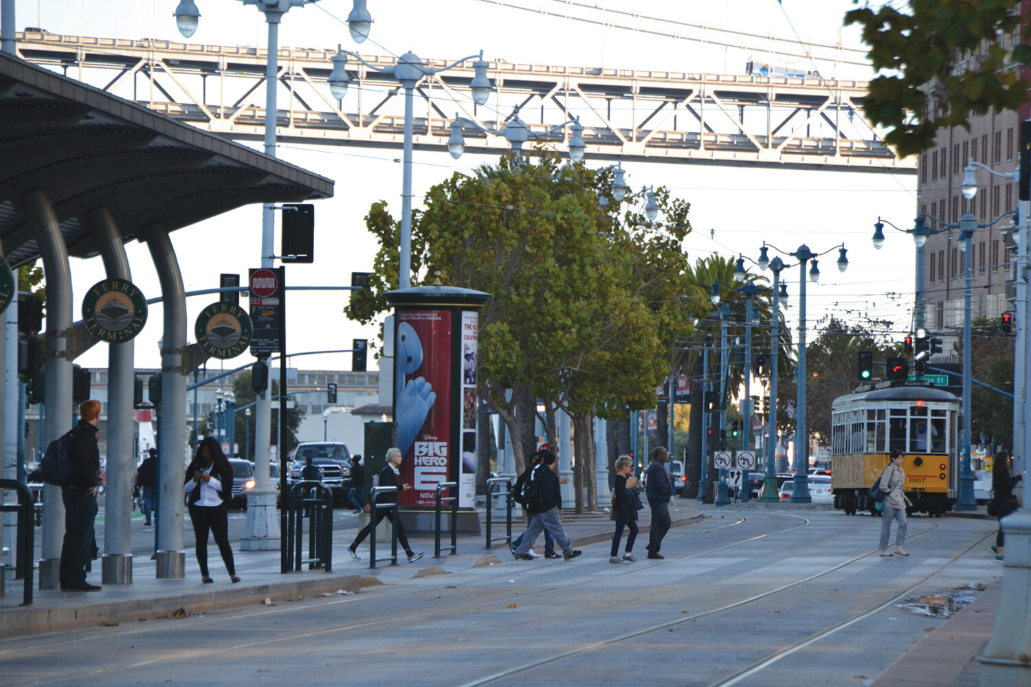 The elevated structure is removed to create an equitable street for multiple users. Accommodating transit lanes increases the street’s capacity. Cycle facilities and an improved pedestrian realm result in safer and more-comfortable experiences for walking and cycling.
