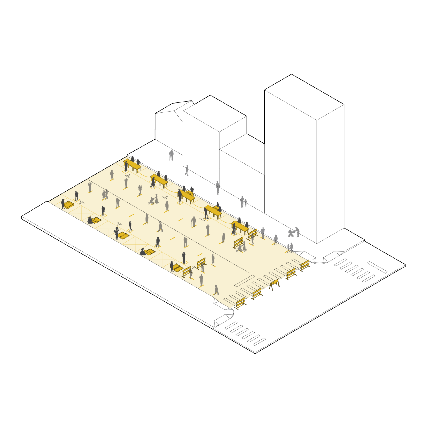Expand market footprints into adjacent streets to relieve crowding and support physical distancing.