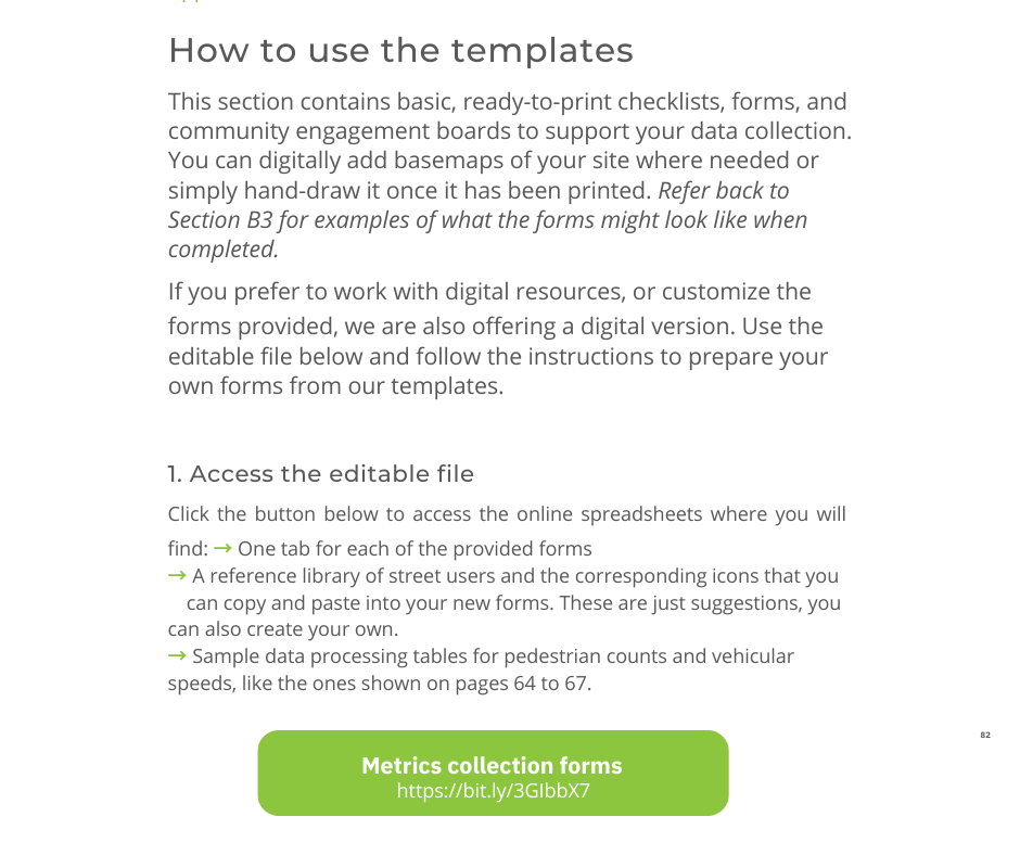 GDCI’s How to Evaluate Street Transformations guide contains basic, ready-to-print checklists, forms, and community engagement boards to support your data collection. You can digitally add basemaps of your site where needed or simply hand-draw it once it has been printed. Refer back to Section B3 for examples of what the forms might look like when completed.