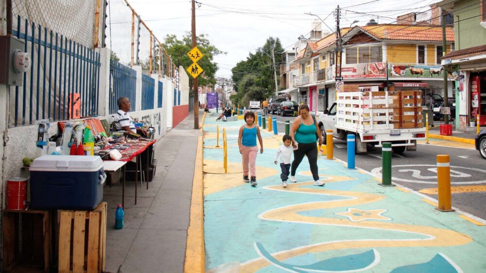 The Municipality of León partnered with Colectivo Tomate to create an interim street transformation pilot that benefited nearly 1000 children. Design elements to encourage children to use the space safely includes colorful extended pavements with flexible benches that double as play elements, planters, pedestrian crosswalks, and clear traffic signage enforcing a 20mph (30km/h) speed limit to slow down vehicles outside the school.