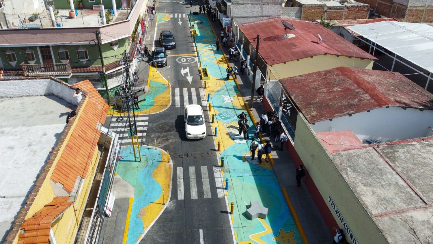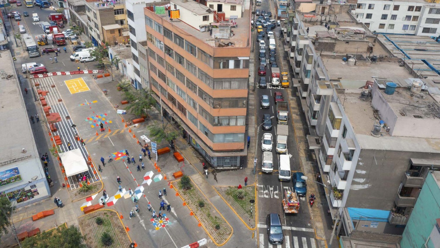 The Municipality of Lima and its urban mobility department pedestrianized a street outside Andres Rosales Valencia school, located on a busy, vehicle-heavy, five-way intersection.