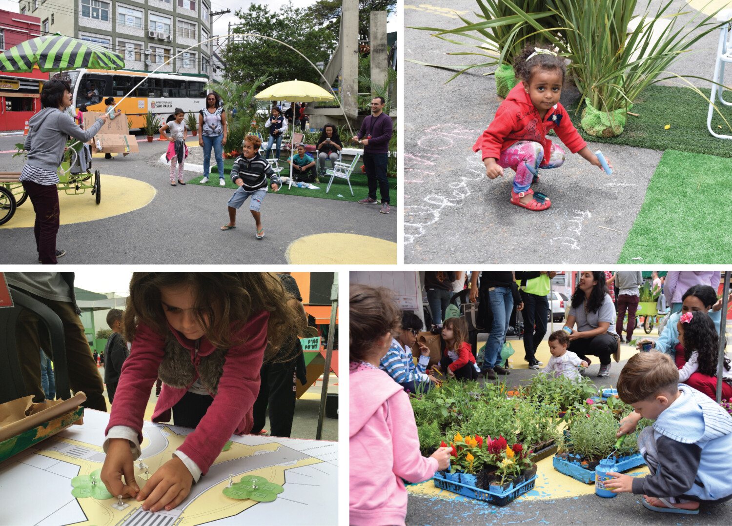 An area of 1600 Sq Mt, in Praca de Getulio Vargas–a dysfunctional roundabout and a large bed of asphalt, was temporarily transformed into a pedestrian plaza with narrowed travel lanes and additional pedestrian crossings with the use of chalk, paint, cones and planters. The space was activated by artificial turf, beach chairs, umbrellas, planned activities of children and music for adults through the day.