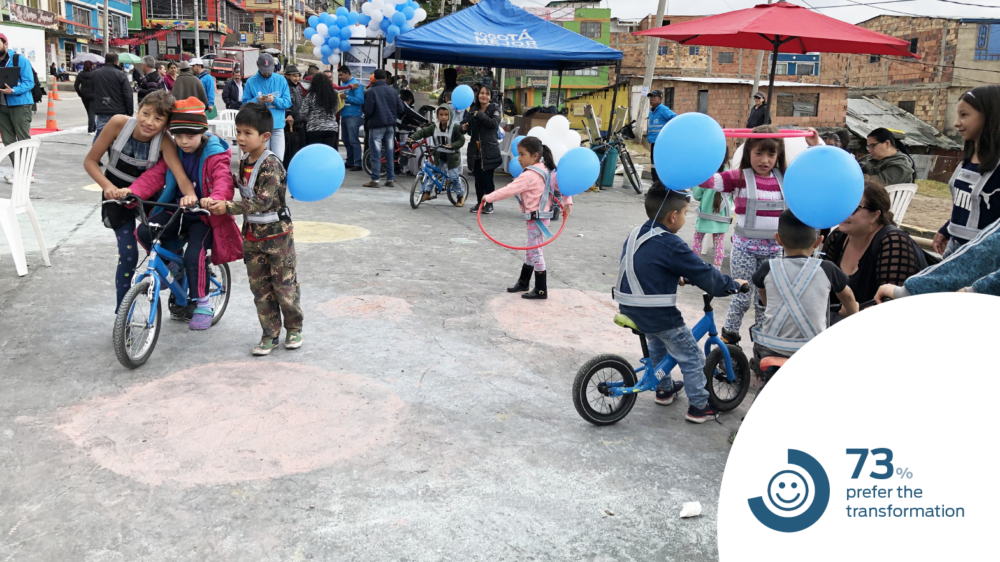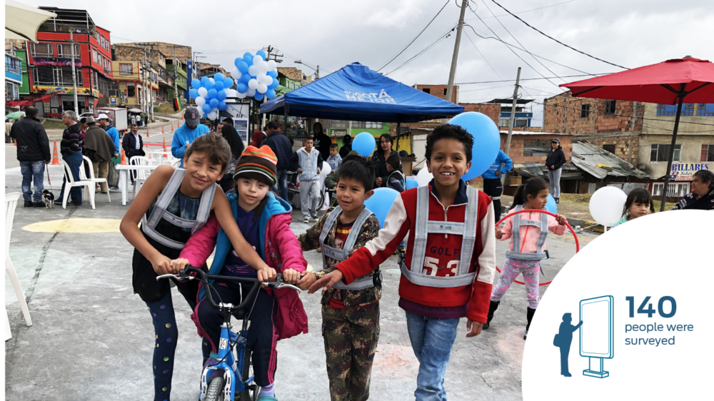 One of these examples in Bogotá’s busy implementation agenda happened in early March, in the Antonio José de Sucre neighborhood. NACTO-GDCI and the Mobility Department of Bogotá implemented a pop-up plazoleta that turned over 1,300 square meters of space used for parking into a public plaza to gather, play, and bike. For a day, the area was cleared of cars; the opened space recovered the view of the mountains, an iconic feature of Bogotá, and received the children and their parents, transit users, and the community in general. The space became a playful area, where kids and families had fun and a safe space to learn to ride a bike.