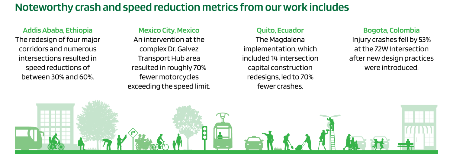 We have seen initial projects catalyze broader national initiatives in Colombia. By building local capacity, implementing key projects, and updating local guidelines, we are achieving regional impact in Addis Ababa, Hanoi, Cordoba, Quito and Guayaquil. Our work in Brazil has reached an immense scale where we have supported over 45 projects in Recife and Salvador and influenced 50 more through our technical guidance. And at the local level, in Cali, Colombia, we have influenced long term policy change through our contributions to the 2024 to 2036 Speed Management Plan.