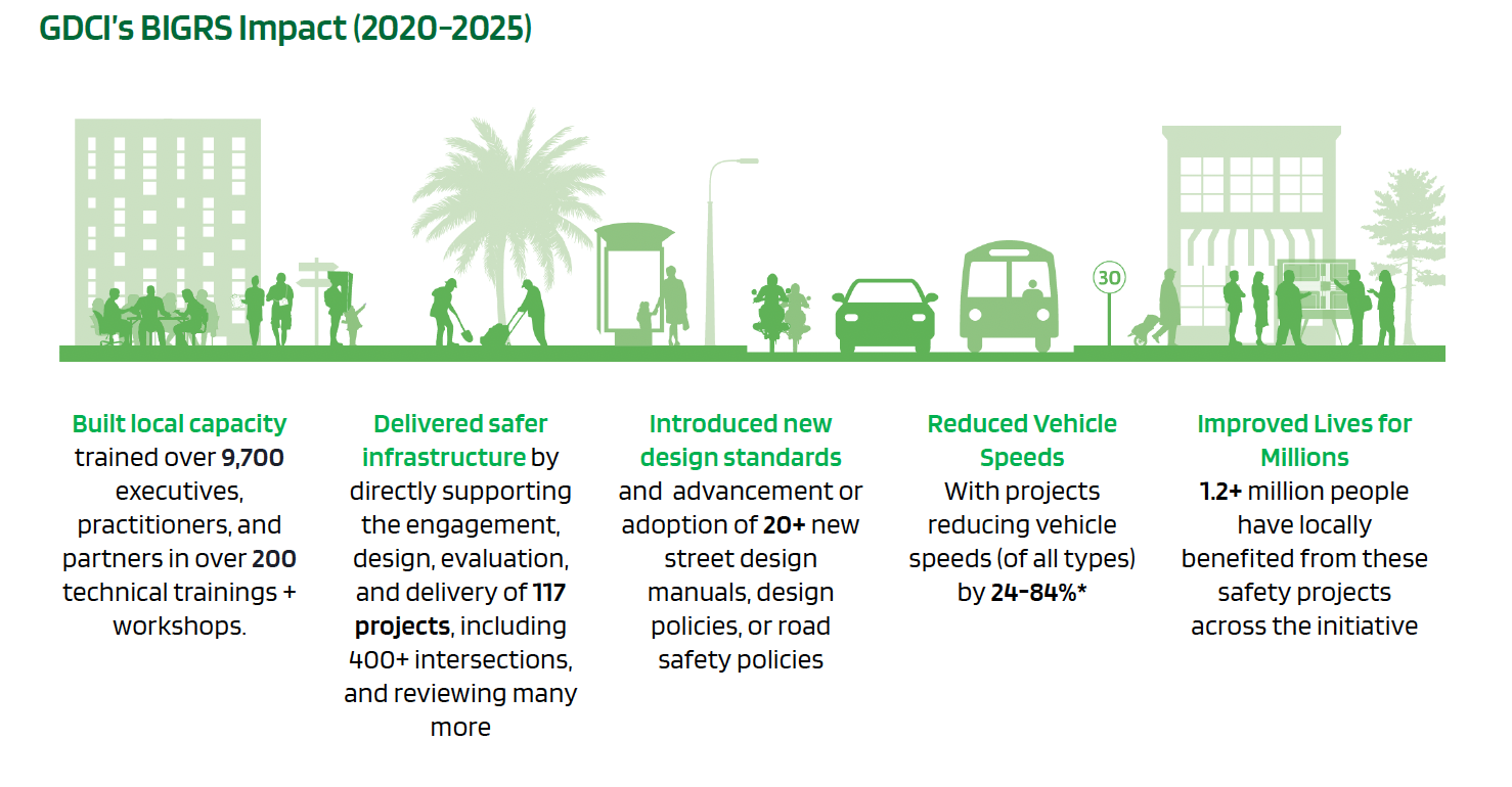 GDCI has been proud to lead and support the design, delivery, and evaluation of safe street infrastructure across 16 cities in 10 countries as a Bloomberg Philanthropies Initiative for Global Road Safety (BIGRS) Partner. The consortium of international partners strives to reduce traffic crash-related fatalities and serious injuries by combining evidence-based best practices in strengthening national legislation; improving data collection and surveillance; changing road user behavior; upgrading vehicle safety; and improving road infrastructure.