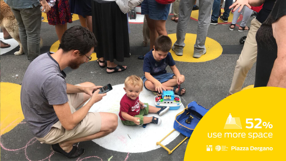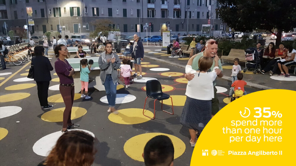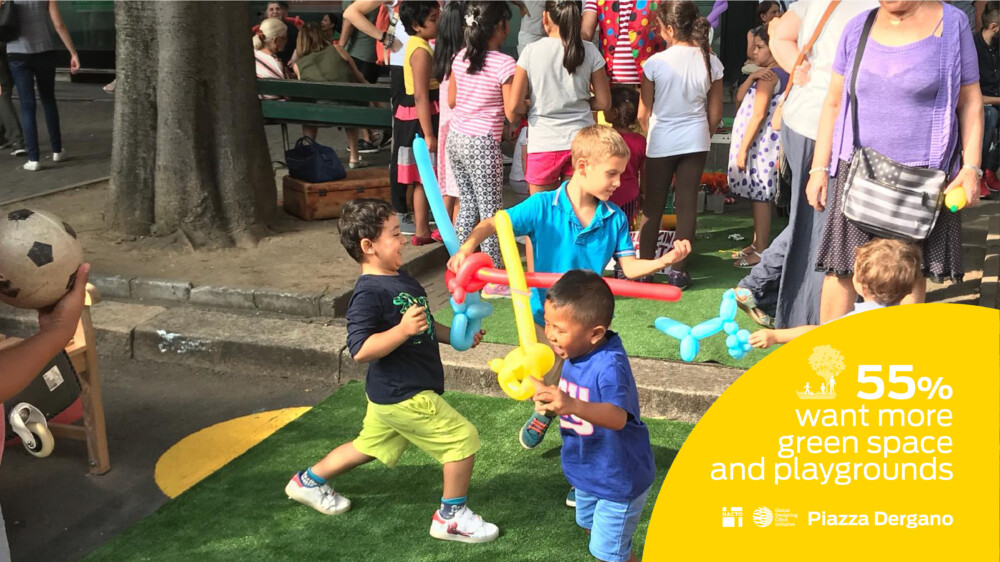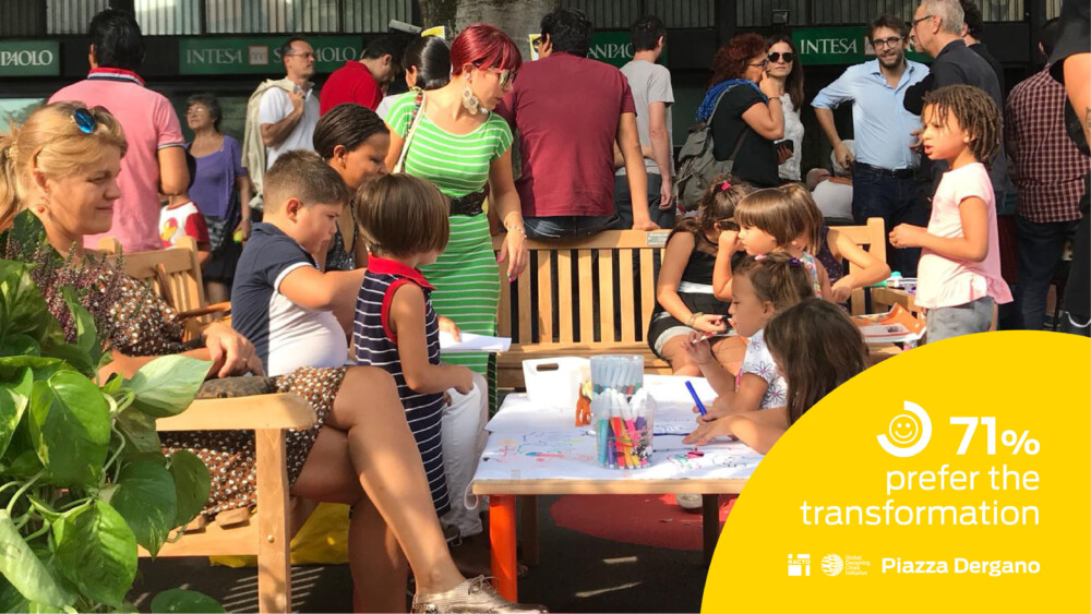 Early survey results in Piazza Dergano show that 86% of people interviewed prefer the pedestrian plaza, 72% use more of the space, and an overwhelming 84% would like the redesigned space to become permanent.